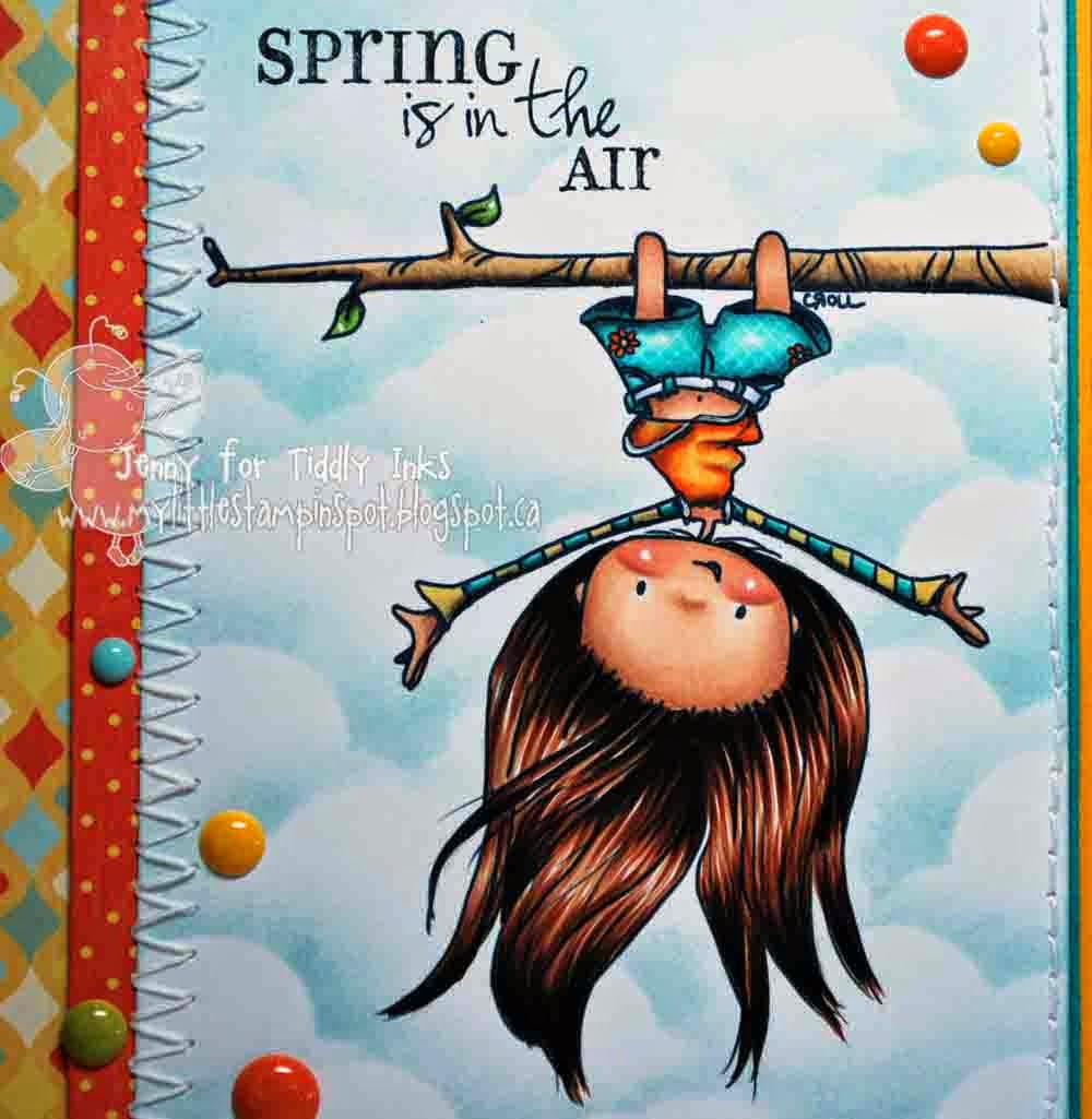 I've used the sweet TI image: Wryn- Hanging Around on my card today. I love how she is hanging upside down! I coloured her with copics and a wee bit of pastels, using the colourless blender to add some texture to her shorts. I used a TCP cloud border die and SU ink to sponge in some clouds in the background. The sentiment is from a TCP set. I added some enamel dots and machine stitching.